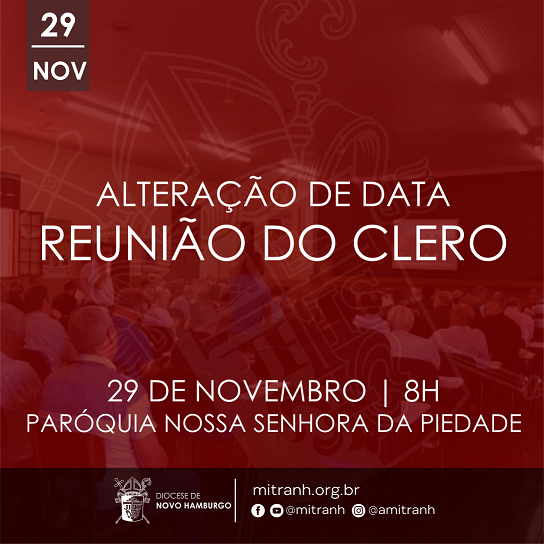 Informamos que, em virtude do falecido do Cônego Werno Blume, a reunião Geral do Clero que ocorreria nesta data (28/11) ocorrerá no dia 29 de Novembro, às 8h , na