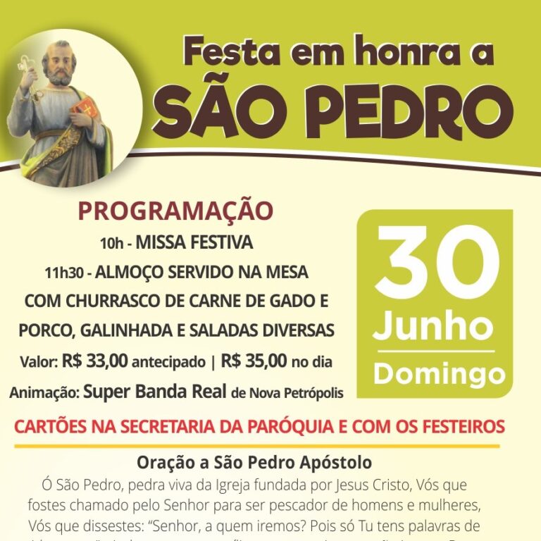 A Paróquia São Pedro Apóstolo, de Ivoti, realizará uma novena em honra a seu padroeiro. Acontecendo entre os dias 21 e 29 de junho, os fieis paroquianos e convidados celebrarão