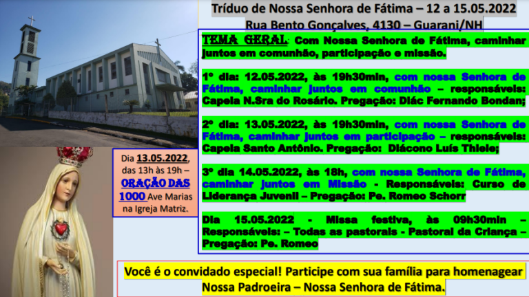 Tríduo de Nossa Senhora de Fátima – 12 a 15.05.2022 Rua Bento Gonçalves, 4130 – Guarani/NH Tema geral: Com Nossa Senhora de Fátima, caminhar juntos em comunhão, participação e missão.