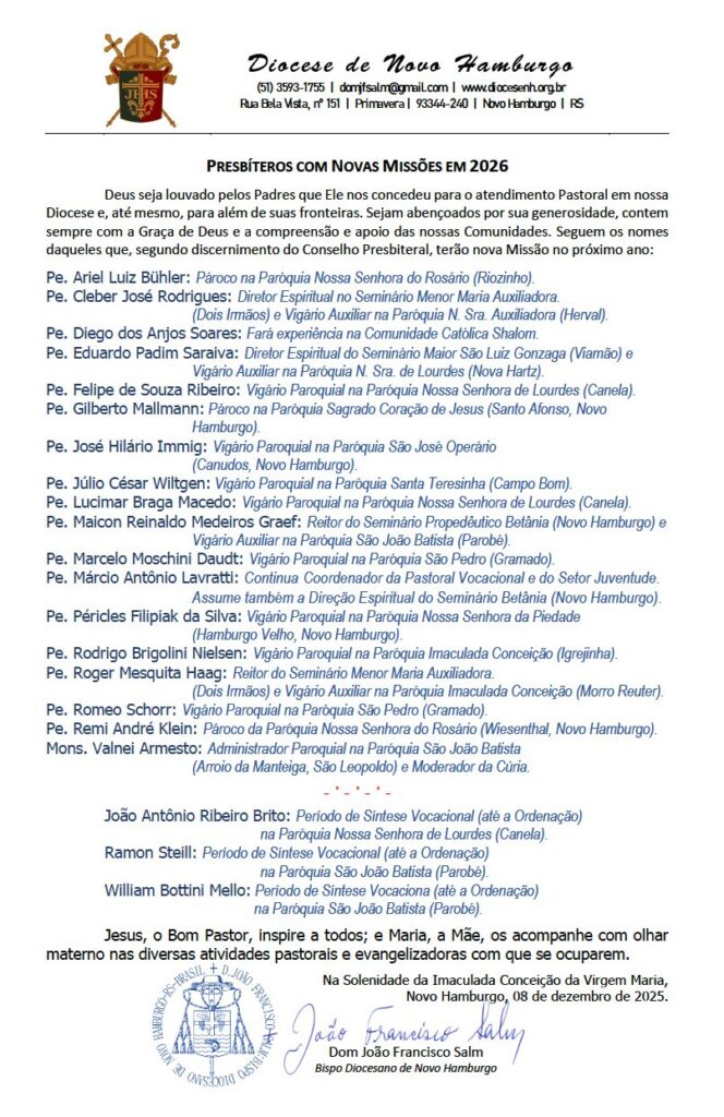 Nesta terça-feira, 9 de dezembro, Dom João Francisco Salm, nosso bispo, publicou o documento que nomeia as novas missões de alguns padres de nossa diocese.